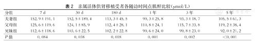 术后<3年,夫妻组受者血肌酐水平与父母组和兄妹组比较差异无统计学意义。术后≥3年,父母组受者肌酐水平显著高于夫妻组和兄妹组,差异有统计学意义,而夫妻组和兄妹组之间比较差异无统计学意义。(表2、图3)