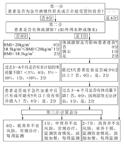 | 3分 | BMI<18.5 kg/m2且一般情况差,或近1个月内体重丢失>5%(或近3个月内体重丢失下降15%),或近1周食物摄入比正常需要量低75%~100% | |