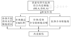 AMR的原发作用起始于DSA和血管内皮细胞表面异体抗原(HLA或非HLA)的有效结合。原发作用机制包括补体依赖性和非补体依赖性作用机制(抗体介导细胞毒,ADCC)两条途径。补体依赖性作用机制中,补体激活后可直接通过形成膜攻击复合体损伤内皮,也可以通过补体片段诱导炎症细胞、或通过补体-补体受体诱导吞噬细胞,导致内皮细胞的损伤。非补体依赖的ADCC途径的作用主要通过Fc受体阳性的有细胞毒功能的杀伤细胞对内皮细胞的损伤(图1)。