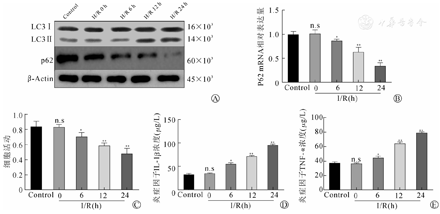 HK-2细胞缺氧6 h,然后在0、6、12和24 h再复氧,免疫印迹法(WB)结果表明,LC3-Ⅱ的表达水平与复氧时间呈正相关性,在24 h表达水平最高,P62的表达则呈现相反趋势(图1A、图1B)。在各时间节点,通过CCK-8分别测定的细胞活力,发现随时间增加细胞活力降低,在24 h处细胞活力最低(图1C)。同时利用ELISA检测细胞培养液中炎症相关细胞因子的表达,结果发现IL-1β和TNF-α表达也随复氧时间的增加而增加,且在24 h累积最为明显。实验结果表明在H/R损伤诱导后HK-2细胞出现炎症反应及自噬产生,且在24 h自噬被过度激活。