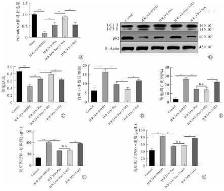 为观察葛根素对HK-2细胞在H/R损伤中的影响。我们通过RT-PCR与WB观察自噬相关蛋白LC3和P62,发现与对照组(Control)组相比,在H/R 24 h时自噬程度最大(图2A、图2B),且细胞活力最差(图2A,图2B,图2C)。通过透射电镜检测各组细胞中自噬体,结果发现应用葛根素干预后,过度自噬现象明显减少,与3-MA作用效果相似,但两者同时干预后自噬标志物P62明显增加,且细胞活力相较单纯葛根素组与3-MA组都有明显增加(图2D)。葛根素的干预同样降低了细胞凋亡程度(图2E)。在葛根素抑制HK-2过度自噬的同时,炎症因子IL-1β和TNF-α也表达降低(图2F和图2G),但与3-MA联合运用并没有起到双重联合作用。总的来说,葛根素在H/R过程中起到有效抑制过度自噬对HK-2细胞损伤的作用。