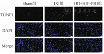 Sham组凋亡检测未见明显凋亡(1.71±0.69)个/HP,IRI+HIF-PHI组凋亡细胞数(6.28±2.37)个/HP要明显低于IRI组(18.57±3.54)个/HP,差异有统计学意义(P<0.01,图2)。