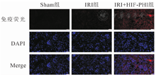 检测HIF-1α的mRNA的相对表达量,以Sham组(1.00±0.79)为标准,IRI+HIF-PHI组(4.85±2.17)的表达水平显著增加(P<0.05);而IRI组(1.64±0.74)的表达虽有增加但没有显著性差异(P>0.05)。免疫荧光可观察到小鼠肾脏组织中HIF-1α的表达情况。与Sham组对比,IRI组在皮质区HIF-1α的表达未见明显增加,而在IRI+ HIF-PHI组可观察到其表达明显增加(图3);然而在髓质区,IRI组HIF-1α的表达增加,而IRI+HIF-PHI组其表达相较于IRI组减少(图4)。