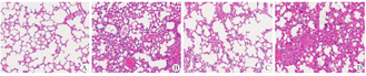 取小鼠肺部组织切片,行苏木素染核,0.5%伊红染料染3~5 min;中性树胶封片。观察小鼠肺组织的形态学变化。肺湿干比:取出左肺上叶后用滤纸吸干组织表面水分,置于锡箔纸上称重,记为湿重;包裹好左肺上叶,放入80°C烤箱内烘烤72 h后,称取每个左肺上叶组织重量,记为干重。湿干比=(湿重-干重)/干重×100%。