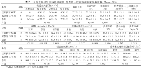 | 分组 | 例数 | GFR[ml/(min·1.73m2)] | 供者血肌酐(μmol/L) | 受者年龄(岁) | 受者体重(kg) | 受者BMI(kg/m2) | ||||