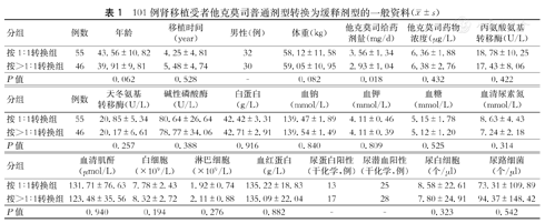 收集2020年1月至2020年6月中山大学附属第一医院术后稳定期他克莫司普通剂型转换为他克莫司缓释剂型的101例肾移植受者资料,男性62例,女性49例,年龄19~69岁,转换时按照等剂量转换和增加剂量转换两种方案进行分组,先对比他克莫司普通剂型转换为缓释剂型后的变化,再根据他克莫司普通剂型转换为缓释剂型不同转换剂量,将受者分为两组:按照1∶1转换组受者55例;按照>1∶1(1∶1.2~1∶1.4)转换组受者46例。比较两组间转换后各项临床指标,如血清肌酐(serum creatinine,Scr)、血尿素氮(blood urea nitrogen,BUN)、丙氨酸氨基转移酶(alanine aminotransferase,ALT)、天冬氨酸氨基转移酶(aspartate aminotransferase,AST)、碱性磷酸酶(alkaline phosphatase,ALP)、血清白蛋白(albumin,ALB)、白细胞计数(white blood cell,WBC)、尿白细胞、血红蛋白(hemoglobin,Hb)及空腹血糖(glucose,Glu)等。