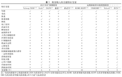 表1归纳总结了相关评估模型所纳入的关键特征变量。由表可知,用于DGF预测的评估模型纳入的平均变量数为5.6个,而用于远期肾功能预测的模型平均变量数为7.8个。同时,超过60%的模型将供者年龄(9/9)、高血压史(7/9)、血肌酐水平(7/9)、死亡原因(6/9)作为特征变量,表明这些因素在不同国家器官捐献肾移植供者评估的重要性和普适意义。