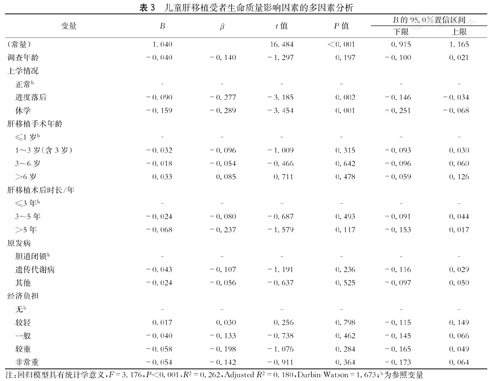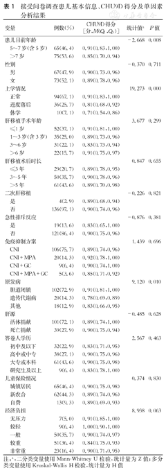 ±s)表示;不符合正态分布者,用M(Q1,Q3)表示。为探究HRQoL的影响因素,进行单因素分析及多因素分析。单因素分析使用非参数检验,其中调查年龄、性别、二次肝移植、急性排斥反应、肝源等二项分类变量使用Mann-Whitney U检验,上学进度、手术年龄、术后时长、基础免疫抑制药物、原发病、答卷人学历、儿童保险情况、经济负担等多分类变量使用Kruskal-Wallis H检验,检验结果P<0.05者进行多重检验,通过Bonferroni校正法调整显著性值。将单因素分析结果P<0.1的因素,和经临床专家讨论认为具有临床意义的因素纳入多因素分析中。多因素分析使用多重线性回归模型,哑变量使用输入法进入模型。P<0.05为差异有统计学意义。
