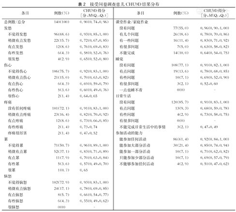 CHU9D得分总分的中位数为0.9(0.74,0.96)分,最高分为1分,最低分为0.47分,非正态分布;天花板效应为18.6%,无地板效应。在日常活动能力方面,仅20例(14.3%)儿童受者受到影响,总体影响程度轻(水平2)。在心理功能方面,有44例(31.4%)儿童受者感到发愁,34例(24.3%)感到伤心,38例(27.1%)感到恼怒,总体影响程度轻(水平2)。在生理功能方面,有69例(49.3%)儿童受者感到累,39例(27.9%)感到疼痛,32例(22.9%)睡眠受到影响,总体影响程度轻(水平2)。社会角色功能方面,有63例(45%)儿童受者在作业方面存在问题,其中14例无法完成作业(水平5),54例(38.4%)参与活动受到不同程度的限制,总体影响程度轻(水平2)。