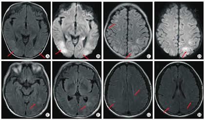 受者,女,6岁,2021年3月因"先天性胆道闭锁,胆汁性肝硬化失代偿期"于华中科技大学同济医学院附属同济医院行肝移植术。术后第2天给予他克莫司+吗替麦考酚酯(MMF)+泼尼松三联免疫抑制治疗,移植肝功能恢复顺利。术后第4天早晨该儿童出现神志淡漠、视物不清、听力下降,并间断抽搐,神经系统检查无定位体征。当晚症状加重,表现为间断癫痫发作、呼之不应,呈浅昏迷,血压152/102 mmHg,心率149次/分,体温38.4℃。予以镇静(咪达唑仑)、降颅压(甘露醇)、降血压及降温等对症处理后癫痫症状消失,各项生命体征恢复平稳。该儿童受者发作前血压正常,他克莫司血药浓度11.0 μg/L。急诊头颅CT平扫提示双侧顶叶低密度影,进一步MRI检查提示双侧额颞顶枕叶、丘脑、部分海马T2液体衰减反转恢复序列(FLAIR)多发异常高信号灶,皮层受累为主,扩散加权成像(DWI)呈高信号(图1A-D),结合临床考虑为PRES,遂停服他克莫司改服环孢素A并继续对症处理。治疗5d后上述症状完全消失。目前术后随访14个月,肝功能稳定,无神经系统后遗症。