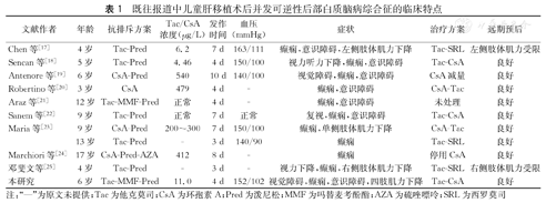 | Sanem等[22] | 9岁 | Tac-Pred | 正常 | 7 d | 正常 | 复视,癫痫,意识障碍 | Tac-CsA | 良好 |