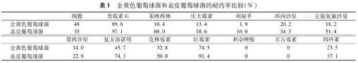 金黄色葡萄球菌和表皮葡萄球菌的耐药率比较(%)