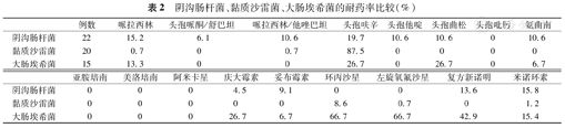 | 大肠埃希菌 | 0 | 0 | 0 | 26.7 | 6.7 | 66.7 | 66.7 | 42.9 | 15.4 |