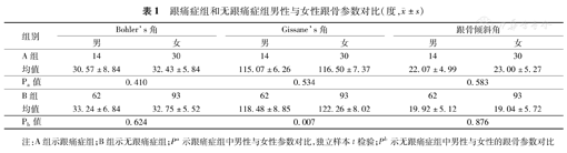 跟痛症组和无跟痛症组男性与女性跟骨参数对比(度,
