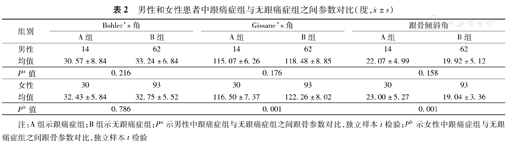 结果显示(表2),男性患者中,跟痛症组跟骨参数与无跟痛症组比较,差异无统计学意义(P>0.05);女性患者中,跟痛症组Bohler’s角与无跟痛症组比较,差异无统计学意义(P>0.05);女性患者中,跟痛症组Gissane’s角以及跟骨倾斜角与无跟痛症组比较,差异有统计学意义(P<0.05)。