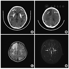 患儿,男,5岁,因"发热3 d,精神萎靡伴四肢乏力1 d"于2013年12月20日入院。3 d前开始出现发热,体温最高达38.8 ℃,伴寒战,无抽搐,有咳嗽,无气喘,无呕吐及腹泻。起病后输液3次(头孢等)热退,入院当天家属诉患儿精神萎靡,不愿言语,表情淡漠,且伴四肢明显无力,冰凉,不能站立。既往史及家族史:出生时正常。家族无遗传、代谢病史,也无类似的疾病史。患儿近1年来经常诉头晕,未检查治疗。入院体格检查:精神萎靡,表情淡漠,问之不答,颈软,双肺及心脏听诊正常,腹平软,肝脾未及,左上肢及左下肢肌力Ⅱ级,右上肢及右下肢肌力Ⅳ级,其余体检均正常。入院初步诊断:中枢神经系统感染?入院后头颅CT提示"双侧大脑半球皮质可见多发性斑片状钙化影,呈对称分布,双侧额叶、右枕叶及左顶叶可见片状低密度灶,边界欠清,部分囊性变"(图1A, 图1B)。诊断:⑴双侧大脑半球多发性高密度钙化灶,考虑为代谢性疾病"Fahr综合征"(特发性非家族性基底节钙化综合征)。⑵双侧大脑半球多发性低密度灶,考虑大面积脑梗死。急诊头颅MRI+MRA(磁共振血管成像)显示:双侧顶叶及颞叶,可见片状长T2信号,右侧额叶及左侧枕顶叶脑回肿胀,并可见片状长T2信号,DWI上呈现高信号改变,双侧基底节区及额叶可见斑片状混杂信号灶,双侧颈内动脉虹吸曲C1段狭窄,双侧大脑前、中、后动脉不同程度狭窄,大部分分支未显影,颅内见多发扭曲管影(图1C, 图1D)。诊断:⑴亚急性脑梗死,⑵Moyamoya病(烟雾病),⑶双侧基底节区钙化灶。血常规正常,肝肾功能、心肌酶谱正常,血氨正常,免疫全套正常,病原学检查均为阴性,风湿全套正常,脑脊液常规检查正常;血钙及血磷均正常,其他电解质均正常。甲状腺激素水平均正常。甲状旁腺激素水平2.95 pmol/L(正常值1.5~10 pmol/L)。综合患儿的临床表现及辅检结果,诊断为"Moyamoya病合并Fahr综合征"。入院后给予扩管,脱水,营养神经等处理,患儿精神反应、语言表达逐渐好转,右侧肢体肌力恢复正常,左侧肢体肌力逐渐恢复Ⅳ级。病情稳定后,转北京协和医院神经内科进一步确诊,完善相关检查排除了"线粒体脑肌病"等遗传性疾病,诊断为Moyamoya病合并Fahr综合征。