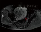 ⑴临床特征 平滑肌肉瘤是一种侵袭性的软组织肿瘤,占所有软组织肉瘤的10%~20%,最常出现于子宫、胃肠道及腹膜后区域[2]。起源于卵巢的平滑肌肉瘤十分罕见。英文文献中报道该病有74例[3],中文文献中约30例,其中来源于血管的卵巢平滑肌肉瘤有11例[4]。报道的文献病例,有以下临床特点:①发病年龄:多为绝经后妇女,发病年龄12~84岁,平均发病年龄约54.9岁[3],该病例患者64岁,符合发病年龄范围;②发病部位:肿瘤大都发生在单侧,少数病例为双侧;③发病症状:该病早期无明显特殊临床症状,随着肿瘤的逐渐增大,会出现腹痛、腹胀、尿频尿急、便秘等周围组织压迫症状,少数合并纤维瘤者可有腹水出现,本例患者主要出现腹胀及恶心呕吐等不适;④疾病早期诊断困难,主要依靠影像学及术后病检确诊,本病例主要依靠彩超及MRI影像学检查,术后行免疫组化确诊。