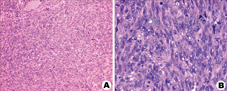 于2017年6月2日行剖腹探查术,术中见:盆腔右侧有一灰褐色囊实性肿物,直径约10 cm左右,来源于右卵巢,肿块包膜光滑,可见破裂口,囊内有暗红色液体流出,与盆底及侧壁、肠管致密粘连,阴道残端可见蚕豆大小瘤体,探查毕,先分离盆腔粘连,切除阴道残端瘤体,再切除右侧卵巢肿瘤,术中快速送病检。病检提示:肉眼可见右卵巢,灰褐色肿物,大小约12 cm×10 cm×10 cm,表面光滑,切面囊实性,质韧,另见灰褐色结节一枚,直径2 cm,切面实质性,灰褐色,质韧。见图2,镜下可见右侧卵巢肿瘤组织排列成束状,纵横交织,坏死显著,瘤细胞为长梭形,界限不清,胞浆丰富红染,胞核圆形、卵圆形,部分核仁不清,病理性核分裂像易见,异型性显著[1]。免疫组化示:SMA(+)、Desmin(-)、Vimentin(+)、CD34(血管+)、部分CD68(+)、Ki-67(+,40%)。病检结果为右侧卵巢梭行细胞性间叶源性恶性肿瘤,结合免疫酶标示卵巢平滑肌肉瘤。术中探查肿瘤直径约10 cm,肿瘤累及右侧卵巢,有包膜破裂,无盆腔淋巴结转移,符合FIGO分期Ⅱc期表现。术后征求患者及家属意见,拒绝行化疗。定期对患者进行随访。2017年9月27日患者来门诊复查示肿瘤标志物CA125水平恢复正常,阴道彩超未见明显异常,肝胆脾胰及泌尿系彩超可见肝多发囊肿及左肾囊肿。2017年10月30日患者因"腹胀不适"及"心慌胸闷"来本院就诊,上腹部MRI示下腔静脉肝段以下水平及右侧髂总静脉多发血栓形成,肝内多发囊肿,双肾多发小囊肿,左肾盂肾盏及所示输尿管上段积水,双侧肾周筋膜增厚,左侧略明显,右侧腰部及双侧背部皮下水肿。肺部CT示双上肺结节,考虑结核。CA125及其他肿瘤标志物水平正常。此后电话随诊患者,患者于2018年4月9日在家中死亡。