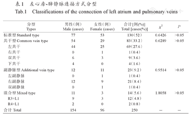 共同静脉出现率38.8%,副肺静脉出现率14.8%,均无性别差异。左心房-肺静脉连接方式可分4型:标准型最常见,有130例(52%);共干型83例(33.2%),是最常见的变异类型;副静脉型23例(9.2%);混合型14例(5.6%),最少见。两侧肺静脉引流模式的变异率为54%,右侧26.8%,左侧42%,均无性别差异。