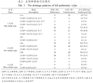 3支型(L3)只有2例(0.8%),1种引流模式:上叶上干静脉、舌干静脉、下叶静脉分别汇入左心房(图1N)。