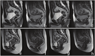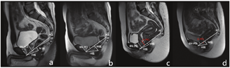 (1) H线(H Line):正中矢状位T2WI图像上耻骨联合下缘到肛管直肠交界处后壁的距离,表示肛提肌裂隙的前后径(图1a~d)。