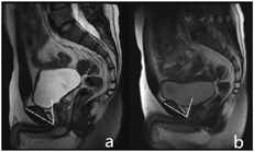 (5)肛管直肠角(anorectal angle,ARA):正中矢状位T2WI图像上直肠后壁与肛管轴线的夹角(图2a、图2b、图2e、图2f)。