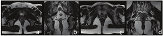 (8)耻骨直肠肌厚度(puborectal muscle thickness,PRM thickness):横轴位T2WI图像上PRM显示为经耻骨联合下缘水平肛管直肠交接处后方相对较厚的"U"形肌肉,最宽处内侧缘至外侧缘垂直走行长轴的距离即为PRM厚度(图4a、图4c)。