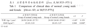 正常青年男女两组的年龄差异无统计学意义(P >0.05),BMI差异有统计学意义(P<0.05)。详见表1。