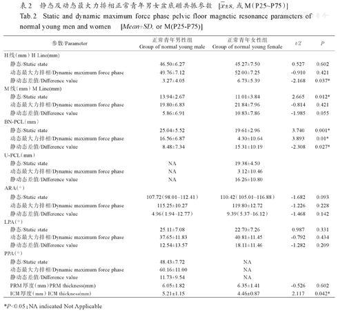 正常青年男性静态M线长度、静态及动态最大力排相BN-PCL线长度明显大于女性(P<0.05);男性髂尾肌厚度明显大于与女性(P<0.05);两组静态及动态最大力排相ARA、LPA值差异无统计学意义(P> 0.05);耻骨直肠肌厚度差异无统计学意义(P>0.05);比较静动态各参数差值,女性H线、BN-PCL线静动态差值明显大于男性(P<0.05)。另将两组动态最大力排相ARA值减小的数值除外,结果详见表2。