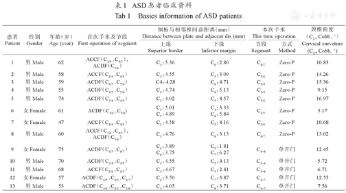ACDF和ACCF手术已被证实是治疗颈椎病安全、有效的术式,但术后易出现相邻节段椎间盘应力增加、活动度增大,导致相邻节段间盘退变加速,严重情况下出现间盘突出压迫脊髓或神经根,从而出现新的临床症状。ASD是前路融合手术常见的远期并发症,经正规保守治疗3个月无效的患者应予以外科干预。