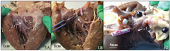 A:沿血流方向打开的猪左心室(未显微解剖) B:解剖后的猪心室间隔左侧观 C:另一心脏解剖后的房室传导轴(嵴上观)