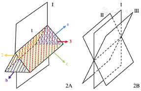 A: Schematic diagram of drawing materials; B: Schematic diagram of unbalancing direction 1, Membranous part of interventricular septum; 2, Right surface of interventricular septum; 3, Left surface of interventricular septum Plane "a" was the first cutting, plane "b" was the second cutting, and plane "c" was the third cutting in the process of drawing materials. Plane "I" was the ideal slicing plane. However, due to the operating error and imbalance of the tissue block during embedding, embedding surfaces such as "II" (Left surface of interventricular septum) and " III" (Right surface of interventricular septum) were prone to appear.