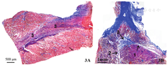 A: Longitudinal section of atrioventricular bundle (The proximal portion of atrioventricular bundle was showed in left-hand side of panel); B: Transversal section of atrioventricular bundle 1, Left bundle branch; 2, Right bundle branch; 3, Atrioventricular bundle; 4, Membranous part of interventricular septum