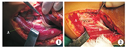 桡神经深支自发性断裂是一种少见的桡神经不明原因损伤性疾病,主要表现为无明显外伤原因造成桡神经损伤综合征。1966年日本Abe等[1]首次报道了3例桡神经深支狭窄,轴索断裂,仅有外膜连续,指伸及拇指伸肌瘫痪,未见外在致压物,成因不明。国内最早报道此类疾病是1985年孔令震等[2]报道的3例桡神经深支狭窄,呈线扎样,成因不明。1988年,张咸中等[3,4]等报道了2例桡神经深支自发断裂,并命名。对于病变较轻,可给予保守治疗,如经保守治疗后症状无明显改善或逐渐加重可行神经探查松解。对于有明确外伤史如:骨折移位或外力直接击打、挤伤致伤者,其临床症状与旋后肌综合征相类似,绝大多数在术中可作出诊断。王德华等[5]认为,该疾病具有急性发病的特点,无外伤史,可有前臂及腕部的过度疲劳病史。2007年郭雅娣等[6]对桡神经深支自发性断裂的解剖学研究中推测桡神经深支断裂的解剖因素与桡侧腕短伸肌腱性结构、桡侧返血管及Frohse弓机械性、周期性、长期动力性压迫有关。据此,可以推测本例患者前臂过度旋前、旋后使Frohse弓及桡侧腕短伸肌腱性结构交替出现紧张或松弛,并且桡侧返血管扩张充血、增粗,加重血管对神经卡压、夹持作用致使桡神经深支断裂。治疗上对于保守治疗无效、已出现无力和肌肉瘫痪,应尽早手术探查解除各种原因对神经的压迫[7]。如果术中发现病变部位出现束膜及轴突断裂无神经束通过伴异常增生、纤维化,则需断端修整至正常神经乳头后吻合神经外膜;如缝合后张力大,则屈曲肘关节并石膏托固定,术后给予营养神经等药物治疗,可辅助中频电刺激促进神经再生;如出现延误治疗或漏诊,应尽早手术修复损伤神经,其预后需进一步观察。