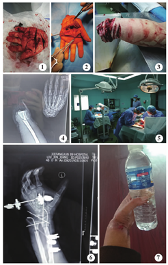 患者 男,46岁,因自残致左腕部多平面离断伤4 h于2019年7月入院。入院查体:患者意识模糊,被动体位;血压:90/55 mmHg,心率:100次/分;双侧瞳孔直径4 mm,对光反射正常,呼吸26次/分,可闻及酒味,随机血糖为22 mmol/L。专科情况:左手自腕关节离断,4个断面不整齐,掌部见3个伤口,前臂见4处伤口,均可见肌腱、神经断端外露,断面不整齐,可见腕骨骨折断端,X线片示腕部离断、尺骨和桡骨骨折(图1,图2,图3,图4)。