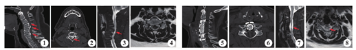 患者 女,68岁,间断性双上肢麻木感并疼痛1年余,体查双侧Hoffmann(+)。影像学检查提示C4至C6-7混合型OPLL(图1,图2),C4-5骨赘椎管占位率为61.3%,脊髓严重受压(图3,图4),JOA评分11.5分。行C4、C5双椎体ACCF加C6-7单节段ACDF手术治疗。术后1年随访时,复查影像学提示椎管减压彻底(图5,图6),脊髓压迫解除(图7,图8),JOA评分14分, Cobb角改善率45.5%。