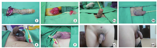 本例所遇困难及处理措施主要有:①患者入院时合并失血性休克,需要抗休克同时施术。术中止血要求仔细及精准,不能损伤主要血管。②本例合并部分阴囊皮肤撕脱,该处无可供吻合血管,撕脱面积较大,为手术效果带来一定的不确定性。③患者术后出现再植组织极度肿胀,一度怀疑为静脉回流不足。但是考虑再植阴茎龟头红润,包皮水肿透亮,阴茎体无硬实改变,动、静脉比例为2:3,发生血管危象的可能性较小。其肿胀考虑为缺血再灌注损伤,淋巴回流障碍,致组织弥漫性肿胀。④阴囊撕脱皮肤术后发生缺血坏死,经过清创后重新缝合,仍可维持阴囊外观完好,无明显阴囊缩小、瘢痕增生等情况。⑤术后局部伤口护理困难,为了避免患者心理刺激,减少女护士观察血运,均由男性家属陪护。应用自制"猪笼"样金属网罩作为局部支撑,然后棉被覆盖,避免床单压迫伤口及保暖。⑥本例为夫妻矛盾导致损伤,为了防止术后情绪不稳,予以实施全方位的心理辅导,渡过不适时期。