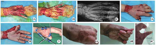 患者 女,36岁,因挤压致左手疼痛、出血、活动受限约3 h于2020年8月入郑州仁济医院创伤骨科治疗,既往史、个人史和家族史无特殊异常。专科检查:左侧全手挤压毁损伤,自左腕近端约5 cm处向手指远端脱套,示、中、环指脱套至远侧指骨间关节,小指完全脱套,拇指脱套至指骨间关节处并关节离断,手掌、手背皮肤挫伤较重,近端出血活跃,手指远端暗紫色,肢体冰凉,无血运,掌侧、背侧可见血管、神经、肌腱断端外露,各屈、伸指肌腱呈抽拉撕裂样损伤,创面污染重,余未见异常(图1A、图1B);X线片示:左手拇指指骨间关节脱位离断、近节骨折、小指末节骨折离断(图1C)。