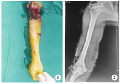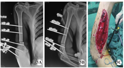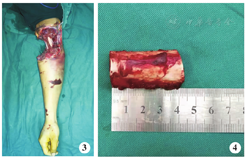 手术方法 急诊入院后完善相关术前检查,在臂丛阻滞麻醉下行右臂清创,彻底剪除污染坏死组织后见:右臂中下段宽约5.0 cm软组织环形缺损,肱二头肌长头、肱二头肌短头、肱肌、肱桡肌部分起点、肱三头肌外侧头及大部分肱三头肌长头、肱三头肌内侧头、肱三头肌腱节段性缺损,肱动脉及伴行静脉、桡神经、正中神经节段性缺损约4.0 cm,软组织仅有部分肱三头肌长头、内侧头肌肉及尺神经相连,约占肢体横截面的1/10,尺神经连续性完整,外膜有长约3.0 cm明显挫伤,肱骨干连续性完整,骨膜缺失约3.0 cm(图3)。使用9 000 ml生理盐水冲洗创面,更换器械手套,重新铺单。微型摆锯截除外露肱骨干约4.3 cm(图4),肱骨远、近两端经皮各置入2枚直径为5.0 mm外固定支架半针,截骨端对合复位后,碳素杆外固定支架固定。显微镜下直接吻合肱动脉及伴行静脉重建肢体血运,正中神经、桡神经断端缝接前分别剪除少许,外露正常神经乳突,无张力下显微缝接,松解尺神经外膜,肌肉断端采用"8"字缝合,缝合时尽量带着肌腱膜缝合,使肌肉缝合断端结实紧密,并吻合贵要静脉及头静脉,皮肤创缘用3-0丝线直接缝合,前臂筋膜室减张后覆盖VSD敷料,桡骨中段拧入1枚直径4.0 mm外固定支架半针,连接臂外架固定肘关节于屈肘30°位。术后1周再植肢体血运良好,前臂肿胀明显减轻,减张切口直接缝合(图5)。术后4周,拆除跨肘关节外固定支架,行上肢关节被动功能锻炼。