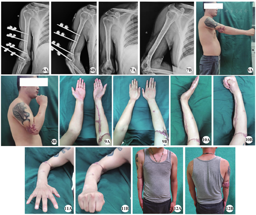通过短缩肱骨降低了节段性软组织缺损修复及重建肢体血运及功能的难度,缩短了手术时间,减少了手术对患者的再打击,同时一期进行了伸、屈肌群及缺损神经的修复,提供了肢体功能恢复的基础,减少了二期肢体功能重建的几率,为肢体节段性严重创伤提供了一种保肢思路。但对肢体严重创伤患者进行保肢需慎重,严格掌握适应证,要充分评估肢体重建血运后对全身脏器的打击及患者的耐受情况,充分考虑保留肢体后功能情况,科学决断保肢还是截肢。术前需要耐心和认真地与患者及其家属沟通,取得患者及家属的理解和合作,术中精心细致地做好每一步骤,术后详细观察患者每一变化,及时给予正确的处理,精心护理,预防各类并发症,鼓励患者提高治愈的信心,系统性康复锻炼贯穿整个治疗过程,使肢体功能最大化。