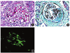 注:A:PAS染色(×400);B:Masson染色(×400);C: IgA免疫荧光(×400)