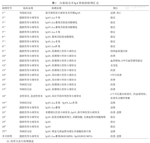 | 1[11] | 肾病综合征 | 新月体性肾小球肾炎及早期IgAN | 进展、死亡 |