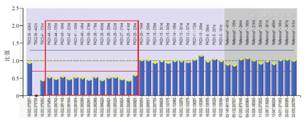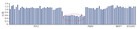 基因诊断:采用高通量测序(next generation sequencing,NGS)的方法行PKD1基因的致病性突变分析;用多重连接探针扩增技术(multiplex ligation-dependent probe amplification,MLPA)验证检测到的PKD1基因的外显子缺失区域。NGS结果提示:先证者携带chr16:2137863-2153896杂合缺失,该缺失区域包含了PKD1基因23外显子-3'非翻译区(Untranslated Region,UTR)以及部分TSC2基因(见图2)。MLPA结果显示:先证者的PKD1基因23-46外显子杂合缺失(见图3)。该缺失变异会导致PKD1基因的mRNA转录与翻译异常,从而产生截短型的、无功能的多囊蛋白1(polycystin-1,PC1)。PKD1基因23外显子-3'UTR杂合缺失可能是该早发型多囊肾患者的致病因素。