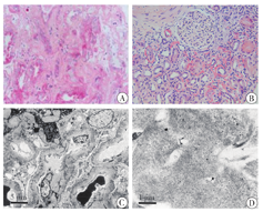 注:A:光镜下肾间质可见均质样特殊蛋白沉积(PAS ×200);B:肾间质区域刚果红染色阳性,肾小球刚果红染色阴性(刚果红 ×200);C:电镜下见肾小球基底膜弥漫增厚伴钉突样增生,上皮下、基底膜内多处块状电子致密物沉积,上皮足突广泛融合,系膜区及肾小球基底膜内侧团块状无细胞区,部分可见纤细纤维结构(电镜 ×8000);D:电镜下见部分肾小管基底膜外侧及肾间质内存在杂乱分布的纤维沉积(电镜 ×30 000)