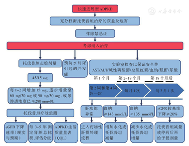 国内现有的ADPKD药物治疗主要以对症处理并发症为主,如控制蛋白尿[6]、处理囊肿出血[7,8]、治疗囊肿感染[9,10]等。近年来,国际上几项大型临床随机对照试验表明,托伐普坦(tolvaptan)能有效抑制ADPKD患者肾囊肿生长,延缓肾功能恶化,包括美国在内的多个国家已批准该药用于治疗快速进展型成年ADPKD患者[11,12,13,14,15,16]。尽管有了新药,但在应用托伐普坦治疗ADPKD患者的过程中,临床医生还面临许多具体问题。鉴于此,2018年10月,美国梅奥(Mayo)临床医学中心Vicente E.Torres教授领衔制定了托伐普坦治疗快速进展型ADPKD的临床实践指南[16],详尽介绍了应用托伐普坦治疗ADPKD的适宜人群、药物剂量选择以及不良反应评估与处理等内容。为使我国肾脏病医师今后能合理使用托伐普坦治疗ADPKD,我们对该指南做一解读。