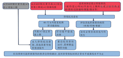 使用托伐普坦治疗ADPKD,应严密监测患者肝功能指标,见图3。当患者出现肝脏损伤症状及体征(疲劳、恶心、呕吐、右上腹疼痛或压痛、黄疸、发热和皮疹等),或谷丙转氨酶(ALT)/谷草转氨酶(AST)升高超过正常上限2倍(或升高超过基线值2倍)时,应立即停用托伐普坦,并在48~72 h内重新检测ALT、AST、碱性磷酸酶和总胆红素水平,以明确肝脏损伤及进展情况。同时,应注意排除导致肝酶升高的其他因素,如疾病(病毒性肝炎、自身免疫性肝炎、酒精性肝炎、非酒精性肝炎、低氧/缺血性肝病、胆道疾病等)、合并使用药物(非处方药、中草药及补品等)、吸食毒品、饮食习惯改变、化学物质暴露或过度运动等。若停用托伐普坦后肝功能异常仍持续存在,应咨询消化专科医生进一步处理。若肝功能异常得以缓解,可在严密监测肝功能的情况下(每周1次,监测1个月,保持ALT/AST水平在正常上限3倍以下),再次启动托伐普坦治疗。当存在明确的肝脏损伤症状和体征,或ALT/AST超过正常上限3倍时,不应重启托伐普坦治疗,其他因素导致者除外。应对托伐普坦引起的肝脏损伤进行持续随访,直到异常指标回到正常水平或基线水平为止。