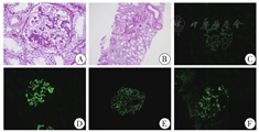 患者男,47岁,因"双下肢水肿4个月"于南京中医药大学附属张家港医院肾内科住院治疗。入院前3天实验室检查:尿潜血3+,尿蛋白3+,血白蛋白33.6 g/L,血肌酐139.8 μmol/L,三酰甘油2.52 mmol/L。无肉眼血尿、腹痛、腹泻、口眼干燥、颜面红斑、脱发、光敏感等症状。既往有"脑梗死后遗症、高血压"病史,否认肝炎、服用可疑药物及进食特殊食物史,其他无特殊。查体:血压180/80 mmHg,右侧肢体活动不便,全身皮肤黏膜色泽正常,心、肺、腹无特殊,双下肢Ⅱ度凹陷性水肿。入院后实验室检查:白细胞6.22×109/L,血红蛋白129.0 g/L。尿常规:潜血2+,蛋白3+。血生化:谷丙转氨酶27 U/L,白蛋白28.0 g/L,肌酐140.1 μmol/L,尿酸537.7 μmol/L,胆固醇7.23 mmol/L,三酰甘油2.96 mmol/L,低密度脂蛋白胆固醇5.18 mmol/L,血糖5.2 mmol/L。尿蛋白量4.95 g/24 h,癌胚抗原、甲胎蛋白、梅毒螺旋体抗体、人类艾滋病抗体、乙肝两对半、丙肝抗体、补体C3、类风湿因子、抗链球菌溶血素"O"试验、抗核抗体、尿本周蛋白、抗中性粒细胞胞质抗体、血清免疫固定电泳等检查均阴性。泌尿系超声见双肾皮质回声增强。