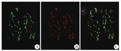 注:A、B:分别见IgA、KM55沉积(免疫荧光染色 ×400);C:A、B图像合并