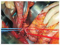 患者女,62岁,主因"上腹部不适5月,加重1月"入院。胃镜检查提示胃体后壁见较深溃疡,活检证实为"低分化腺癌及印戒细胞癌"。腹部CT检查提示"胃窦壁增厚,相邻小弯、胃角不除外受累"。肿瘤标志物CA72-4异常升高。随即在全身麻醉下行远端胃次全切除加D2淋巴结清扫加空肠造瘘术。术中发现副肝左动脉显著增粗,直径约0.8 cm,并见其由腹腔干直接发出,与脾动脉、胃左动脉及肝总动脉呈"H"走形,见图1。