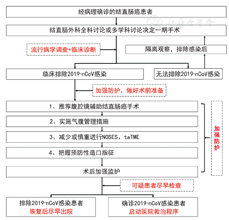 术前严格执行筛选流程,以减少后期院内传染风险。目前新冠肺炎传播的院内感染率达43%[2]。因此,在疫情期间外科患者的收治及传染的防护依然是重中之重。细致进行流行病学调查,科学评估2019-nCoV感染风险,并将患者分为2019-nCoV感染患者、疑似感染患者和未感染患者三类人群,根据不同人群和病情采取相应治疗策略。对于感染患者,除非合并梗阻、穿孔等急诊情况,否则应以治疗肺炎为首;对于合并梗阻患者首先考虑创伤小、恢复快的治疗方案如肠镜下支架置入术;操作时医护人员应进行三级防护。对于疑似感染患者,应进行隔离观察治疗,发生急诊情况时,处理原则同感染患者。对于经排查后未发现流行病学接触史及未感染患者,在疫情未结束之前,考虑到2019-nCoV感染潜伏期较长,为避免交叉感染,仍建议佩戴口罩、单人单病房治疗并限制家属陪同。